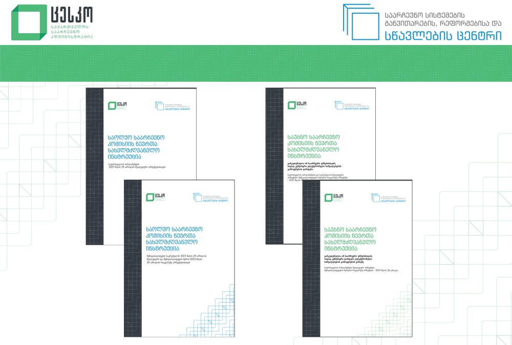 - საოლქო საარჩევნო კომისიის წევრთა სახელმძღვანელო ინსტრუქცია საქართველოს პარლამენტის 2023 წლის 29 აპრილის შუალედური არჩევნებისთვის (მოიცავს ინფორმაციას საოლქო საარჩევნო კომისიის კომპეტენციას მიკუთვნებულ საკითხებზე - როგორც ელექტრონული საშუალებების გამოყენებით, ისე ელექტრონული საშუალებების გამოყენების გარეშე არჩევნების ჩატარების უზრუნველსაყოფად) GEO;