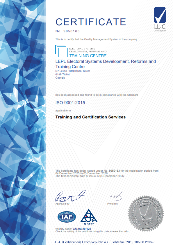 სსიპ საარჩევნო სისტემების განვითარების, რეფორმებისა და სწავლების ცენტრს ხარისხის მენეჯმენტის საერთაშორისო სტანდარტის ISO 9001:2015 სერტიფიკატი მიენიჭა, რითაც ორგანიზაციის საქმიანობის ეფექტიანობა და მომხმარებლების მაღალი ხარისხის სერვისებით უზრუნველყოფა დადასტურდა.